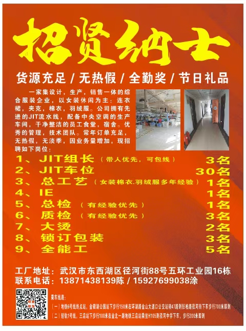 《武汉明妮服饰公司》祝大家新年快乐!本工厂 <缝纫车间> 定于正月十六报到,十七上班,诚挚招聘: